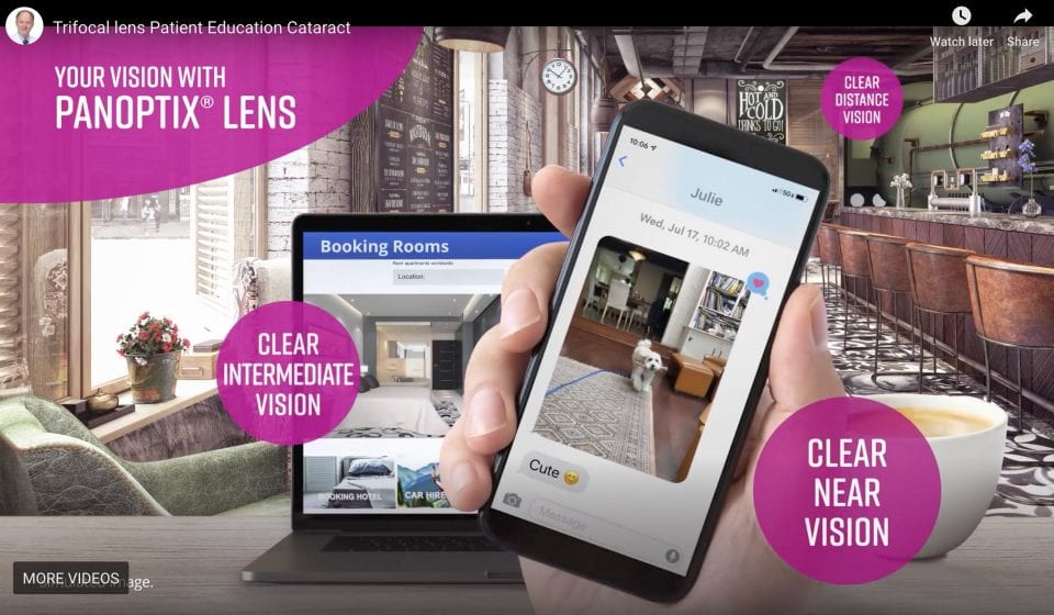 The PanOptix® Trifocal IOL is a type of multifocal IOL used to focus images clearly onto the back of your eye (retina) to allow clear vision after the cataract removal. In addition, the center of the PanOptix® Trifocal IOL allows for better near (reading) vision and intermediate (computer work) vision versus what a monofocal lens would provide.